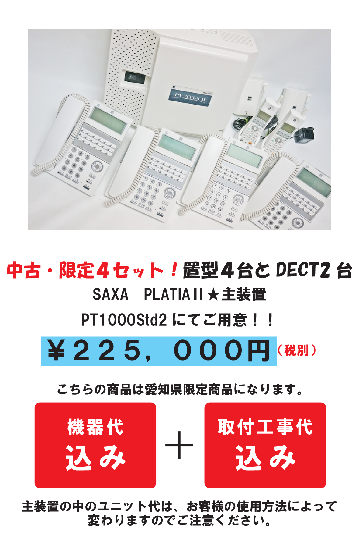 こちらのセット商品は、電話機置型4台とDECT2台セットと、その取付設置工事を含みます。ただし、お客様の現状により、お値段がお安くなる場合もあります。また、オプション工事が発生する場合は、別途料金がかかる場合がございます。金額は是非ご相談ください。