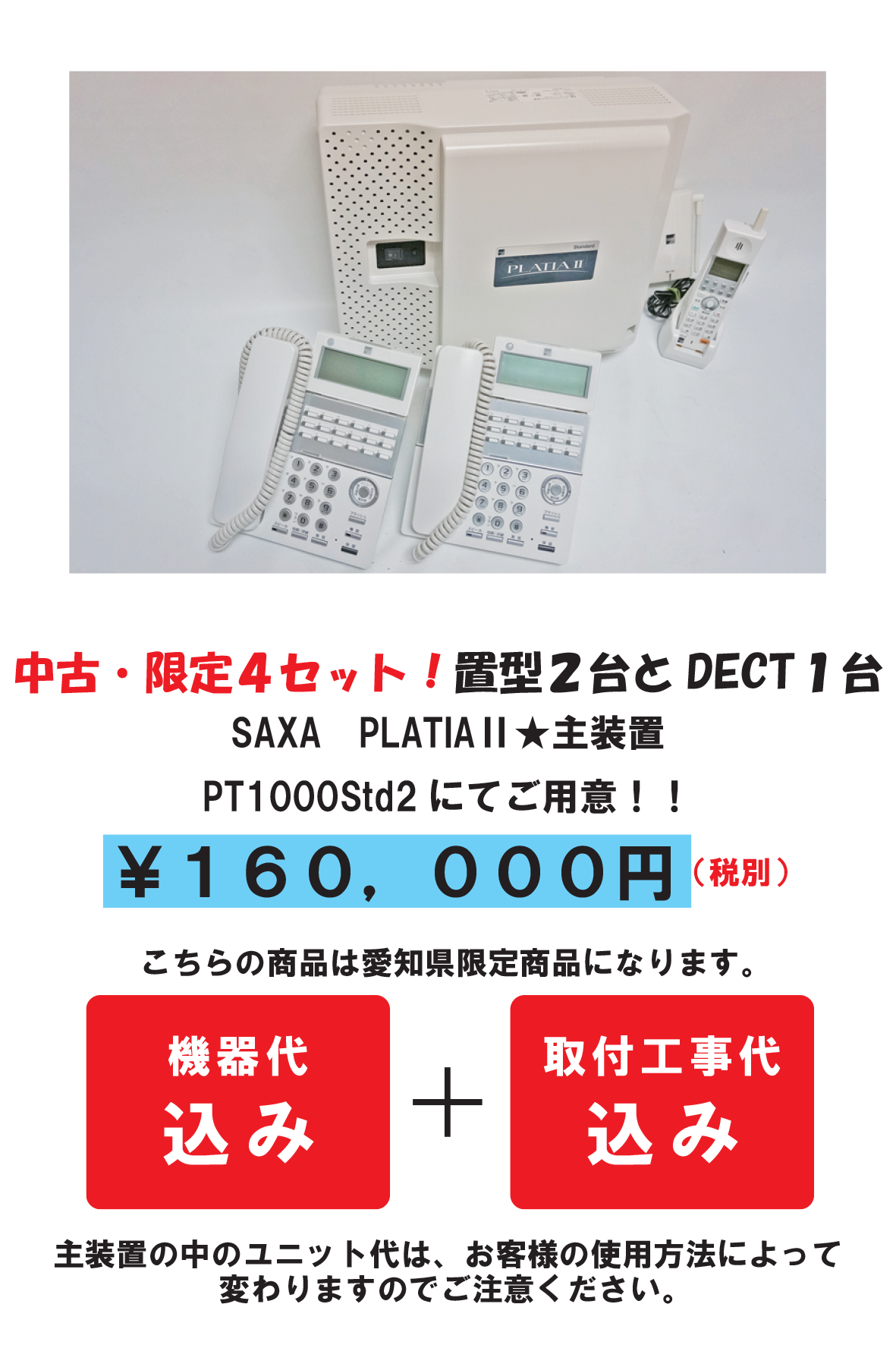 こちらのセット商品は、中古ビジネスホン置型2台とDECT1台と、その取付設置工事を含みます。ただし、お客様の現状により、お値段がお安くなる場合もあります。また、オプション工事が発生する場合は、別途料金がかかる場合がございます。金額は是非ご相談ください。